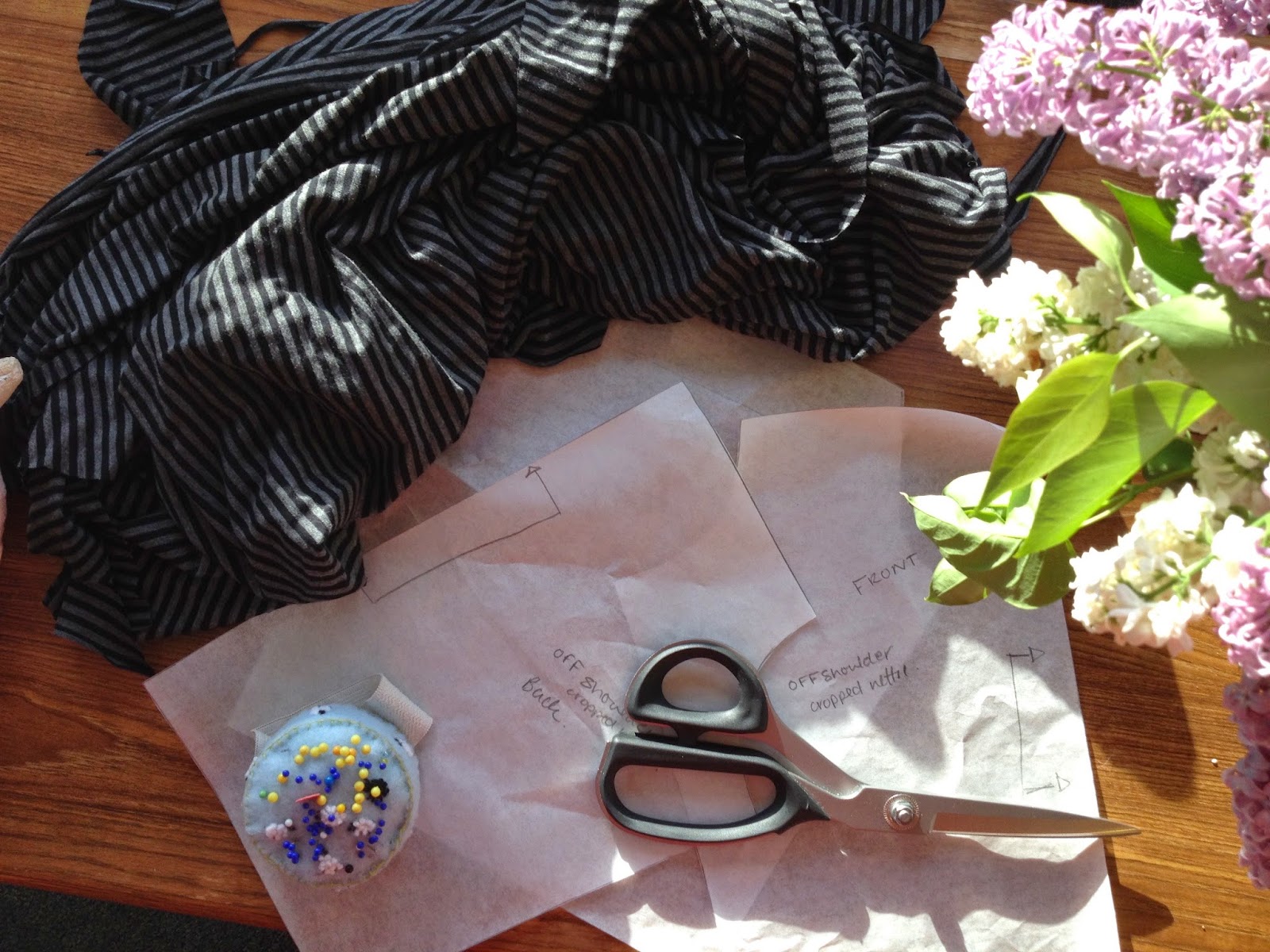 I grabbed this grey and black bamboo knit out of my stash and got to work on my crop-top beauty!