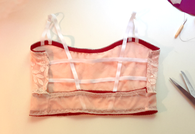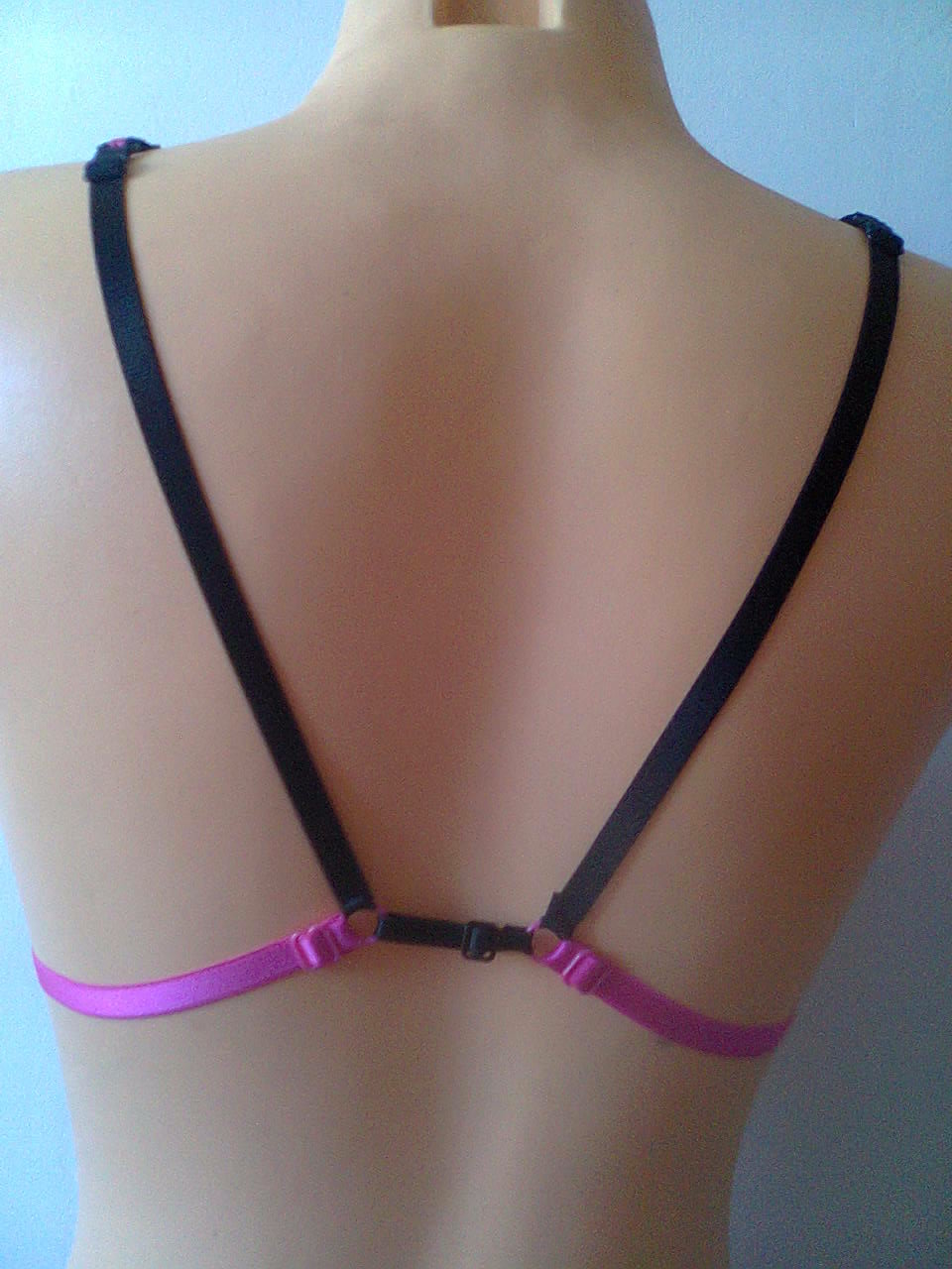 This is David’s Vikki bra, a triangle bikini bra! He made it using pink and black lace, and some ribbons. I love the ribbon in the strap- very cute. And va-va-voom! Love the delicate back-strapping too!