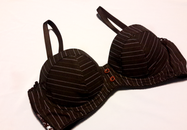 This is Sofia’s second Maya pattern bra- and tweaked with perfect fitting alterations! And this time Sofia was really resourceful with her fabric and made it from her boyfriend’s shirt sleeves! Love it! She even used the cuff buttons for the front embellishment!