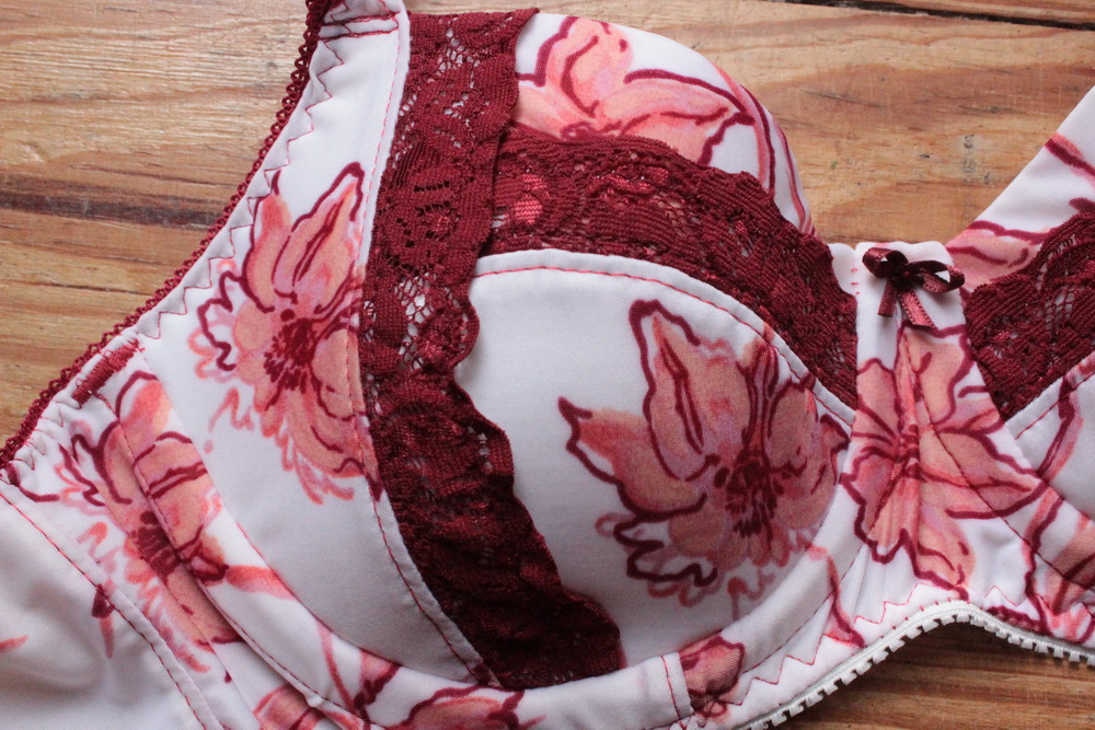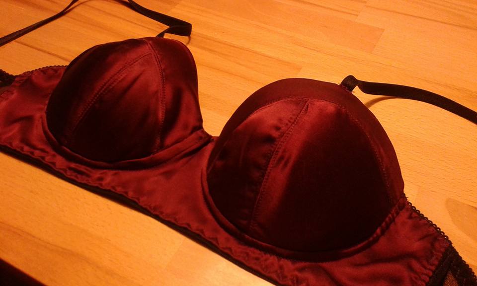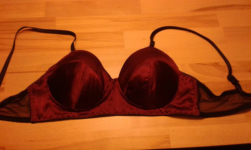 This is the second bra that she’s made using the Maya pattern. This time she made it in this gorgeous deep red silk satin- how luxurious!