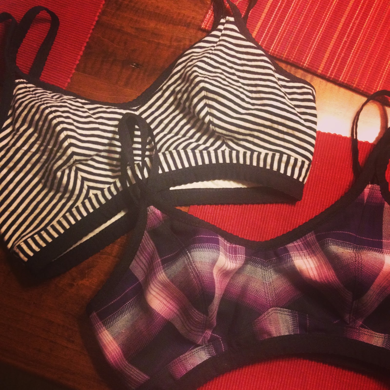 The striped one is made out of stretch cotton jersey and was purely an around-the-house comfy bra for mom to wear, kind of like pjs 🙂 And the purple plaid is made out of flannelette and is super soft and comfy too for my sister.