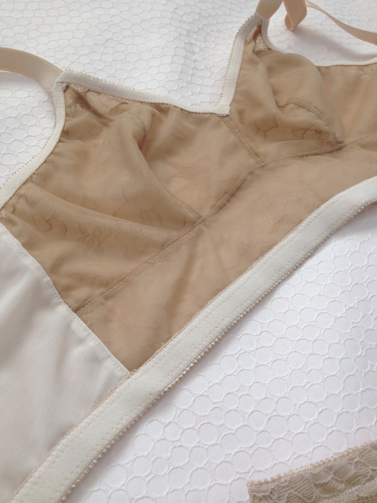 This is beautiful! I was also thinking of nude lace, but there are a few other bra projects on my list.I love the bottoms; is the leg opening high cut? I'm still looking for my ideal panty pattern.